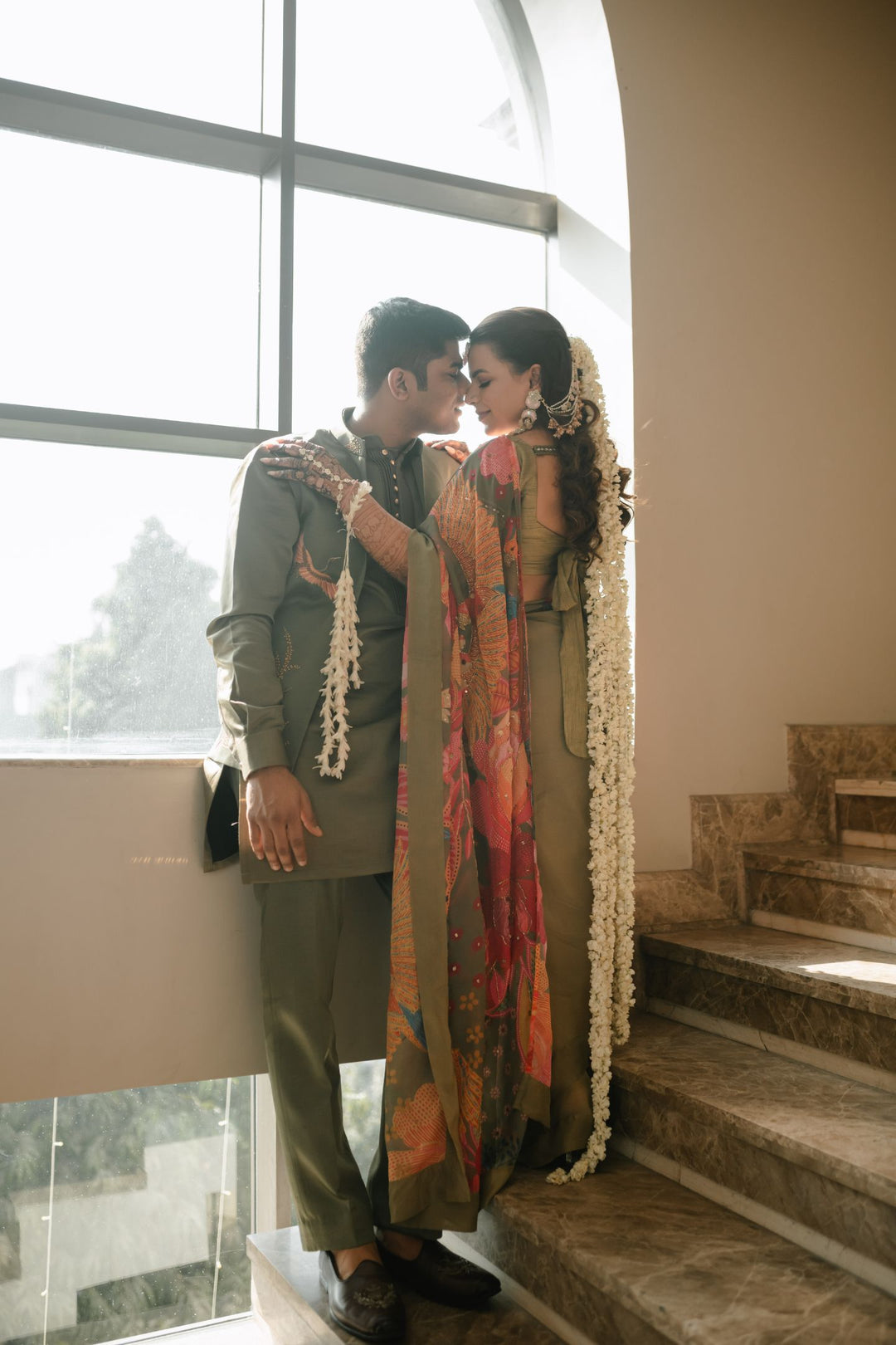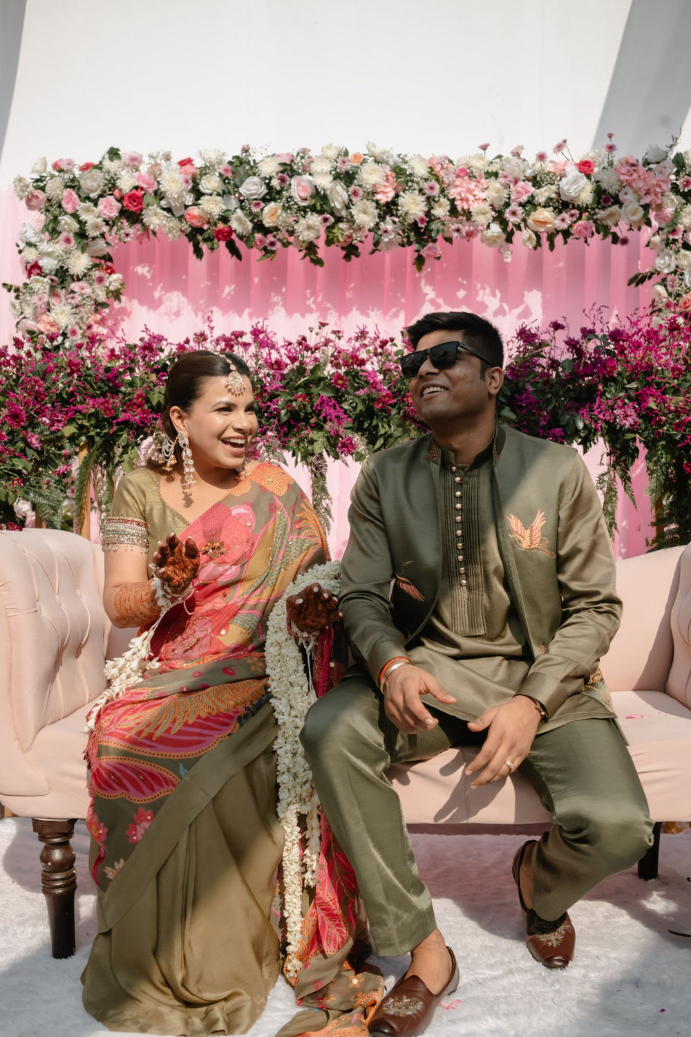 Ritika & Sahil in Custom Mehbooba Set & Olive mens Glam Jacket Set