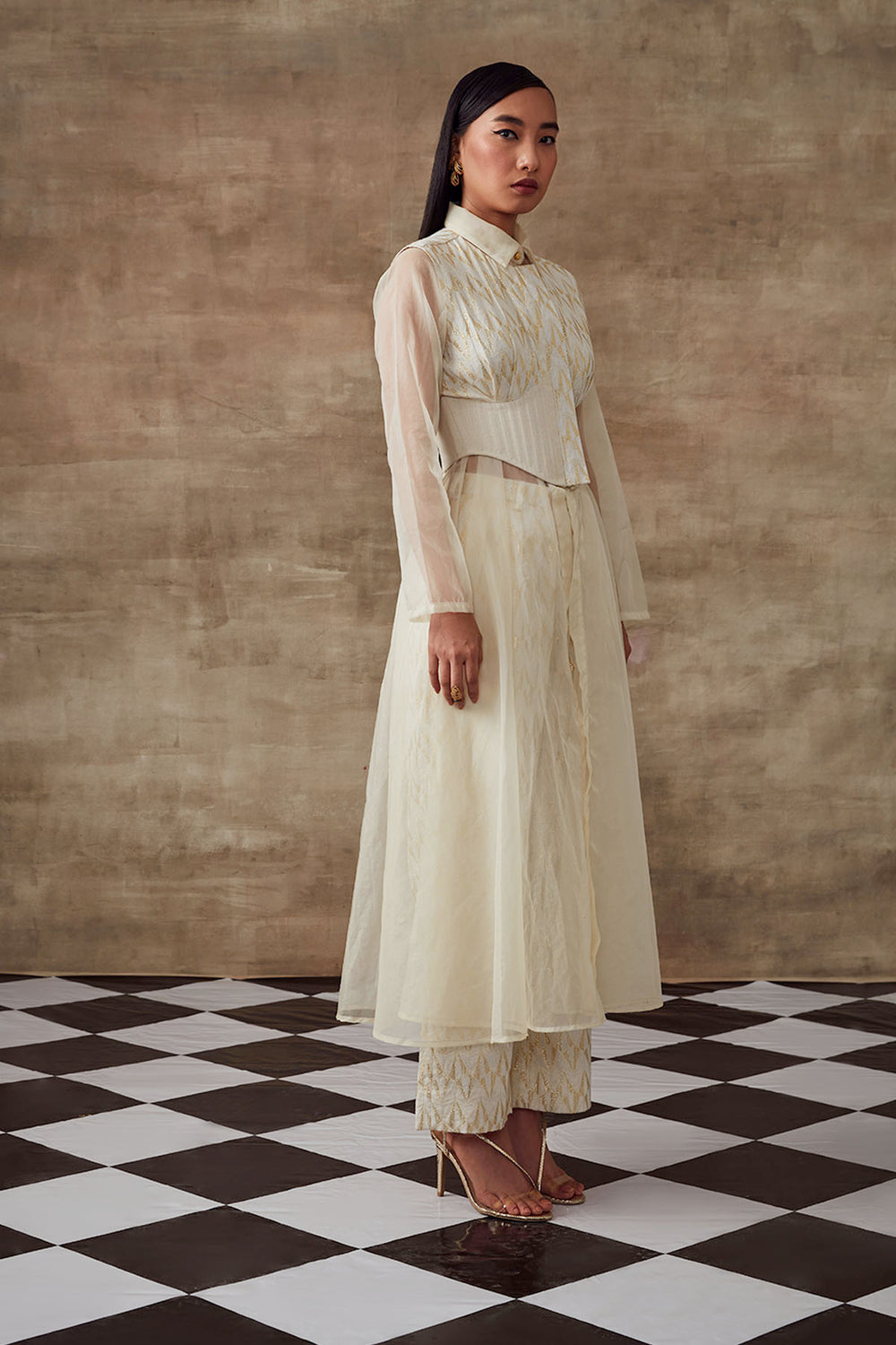 Featuring an organza ivory cape with a jacquard ivory pant enhanced by the over layer of corset top with the details of bling on it .