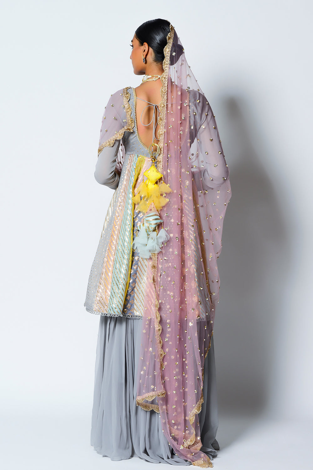 Featuring A Gathered Anarkali In Chanderi Silk And Georgette Base. It Is Paired With Glitter Net Dupatta.