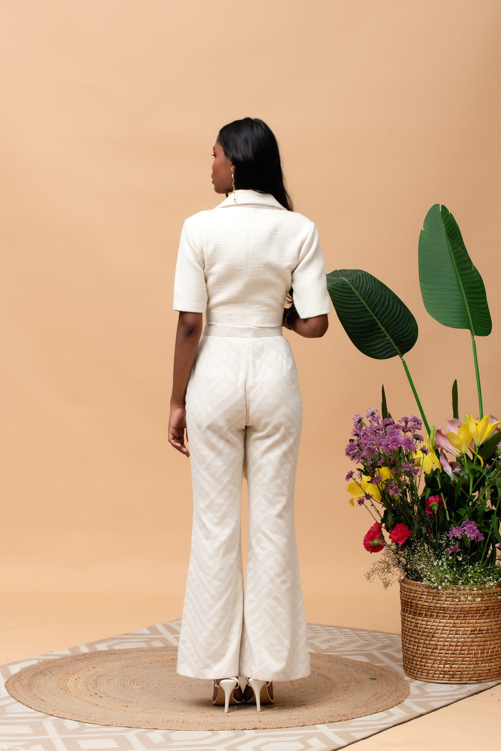 The jute wrap jacket featured along side boot cut pants from the label features fringes alongside a scalloped hemline.