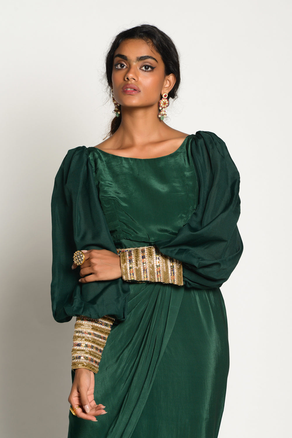 Featuring A Emerald Crepe Drape Body Drape Dress With Gorgeously Embellished Cut-Daana Work Belt And Hand Cuffs.