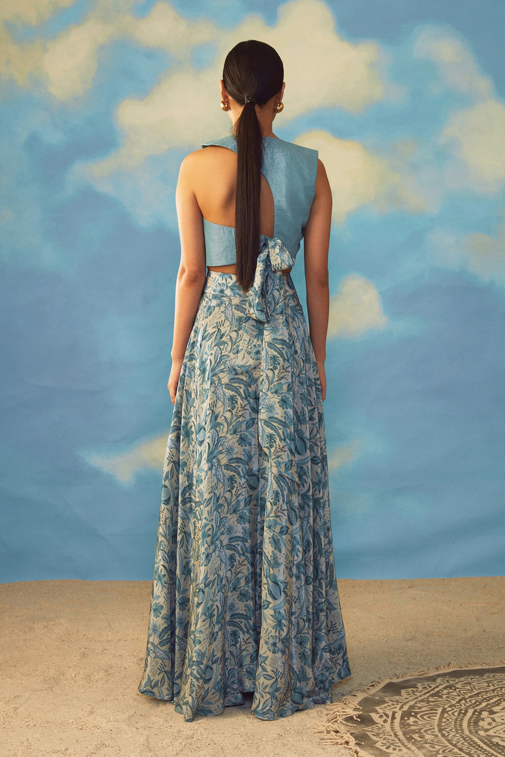 Bringing Forth This Acquamarine Dusky Set Together With A Chic Crop Top Paired With Flared Long Skirt With Cotton Lurex And Crepe Base With Magnificent Cut Dana Work On Blouse Neckline And Hemline.