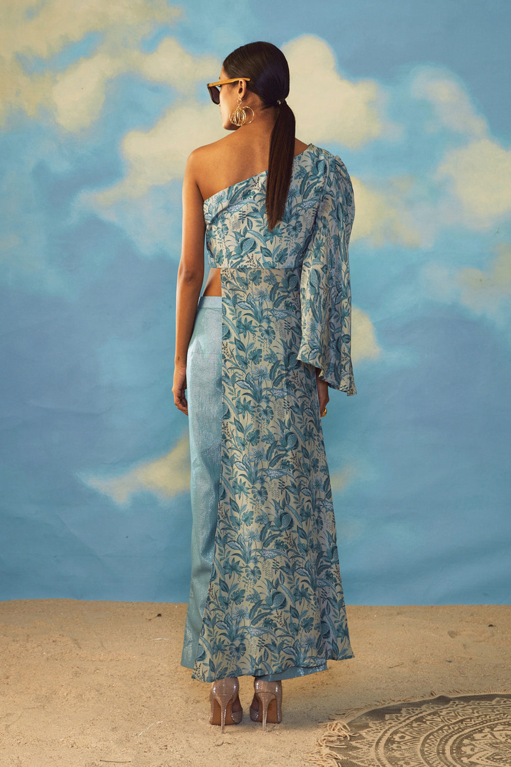Featuring This Lavious Indo Western Floret. It Includes One Off Shoulder Tunic With Full Sleeve Along With Pants With Crepe And Cotton Lurex Base Complimented With Splendid Cut Dana Work