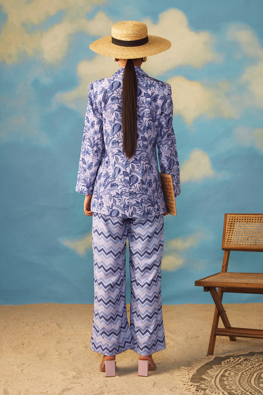 Featuring A Classy Day Brunch Look With A French Peri Blazer With Wide Legged Printed Pants Made Out Of Crepe And Rayon As The Base Fabric.