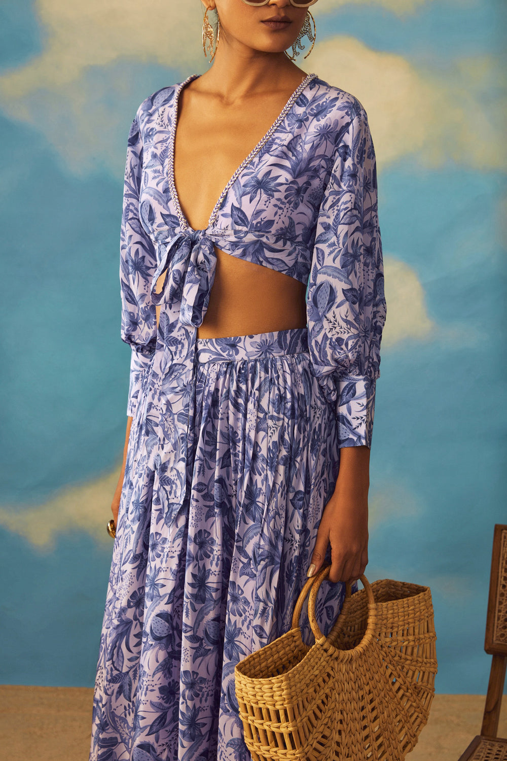 Bringing Forth A Classic Bollywood Feel Veri Peri Knots Made Out Of Crepe Fabric, The Set Contains Deep Vneckline Top With Front Tie Up And 3/4Th Sleeve Along With Flowy Pleated Skirt. The Outfit Is Ornamented With Intricate Cut Dana Work.