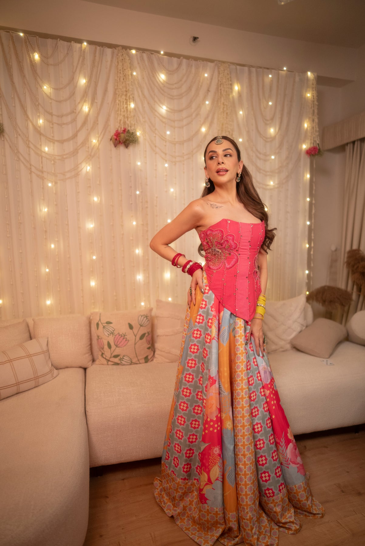 Design Elements: Hand-embellished corset and Geometrical floral printed flared lehenga