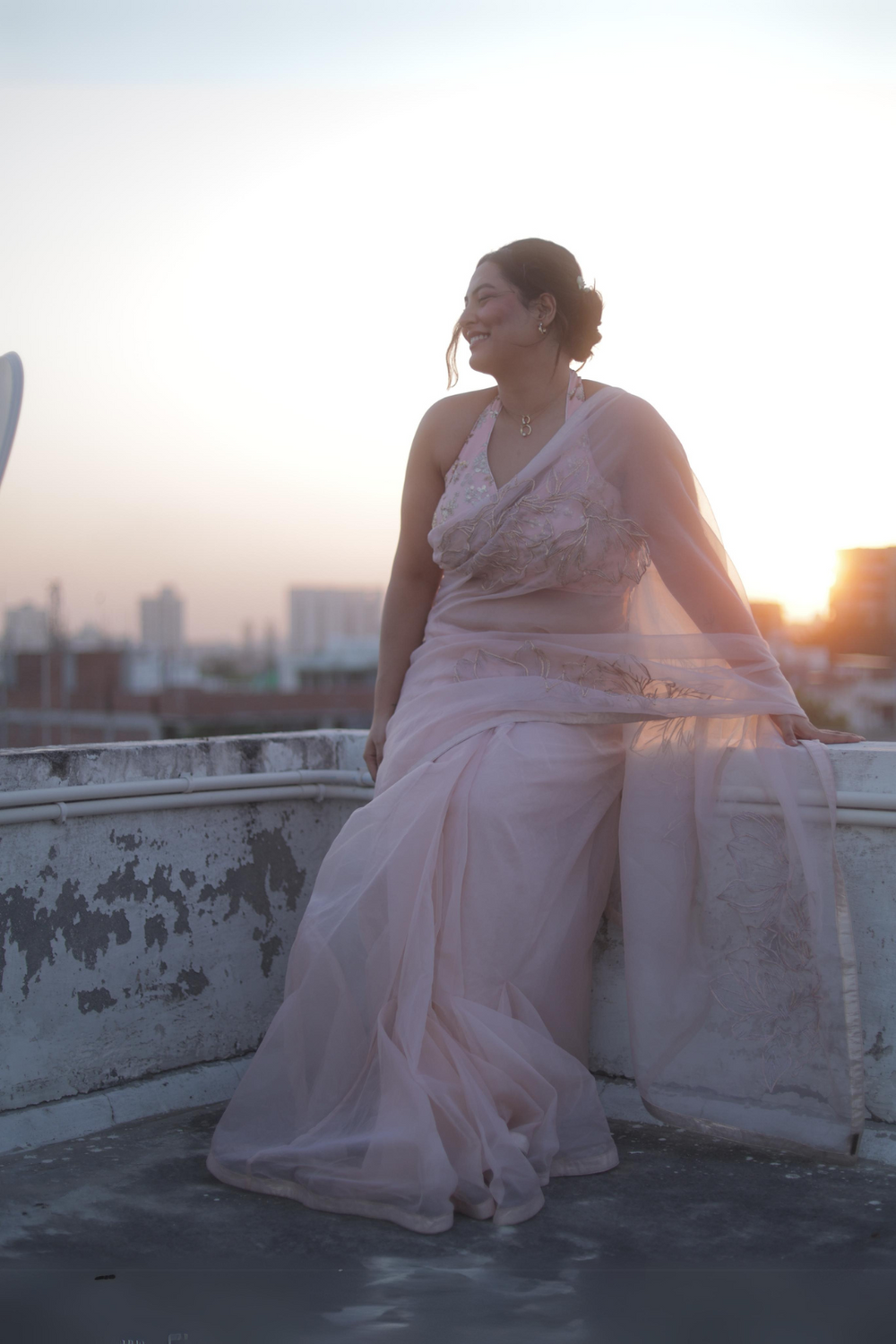 Featuring a rose pink hand-embroidered organza saree in addition to kalidar pleats at the bottom.