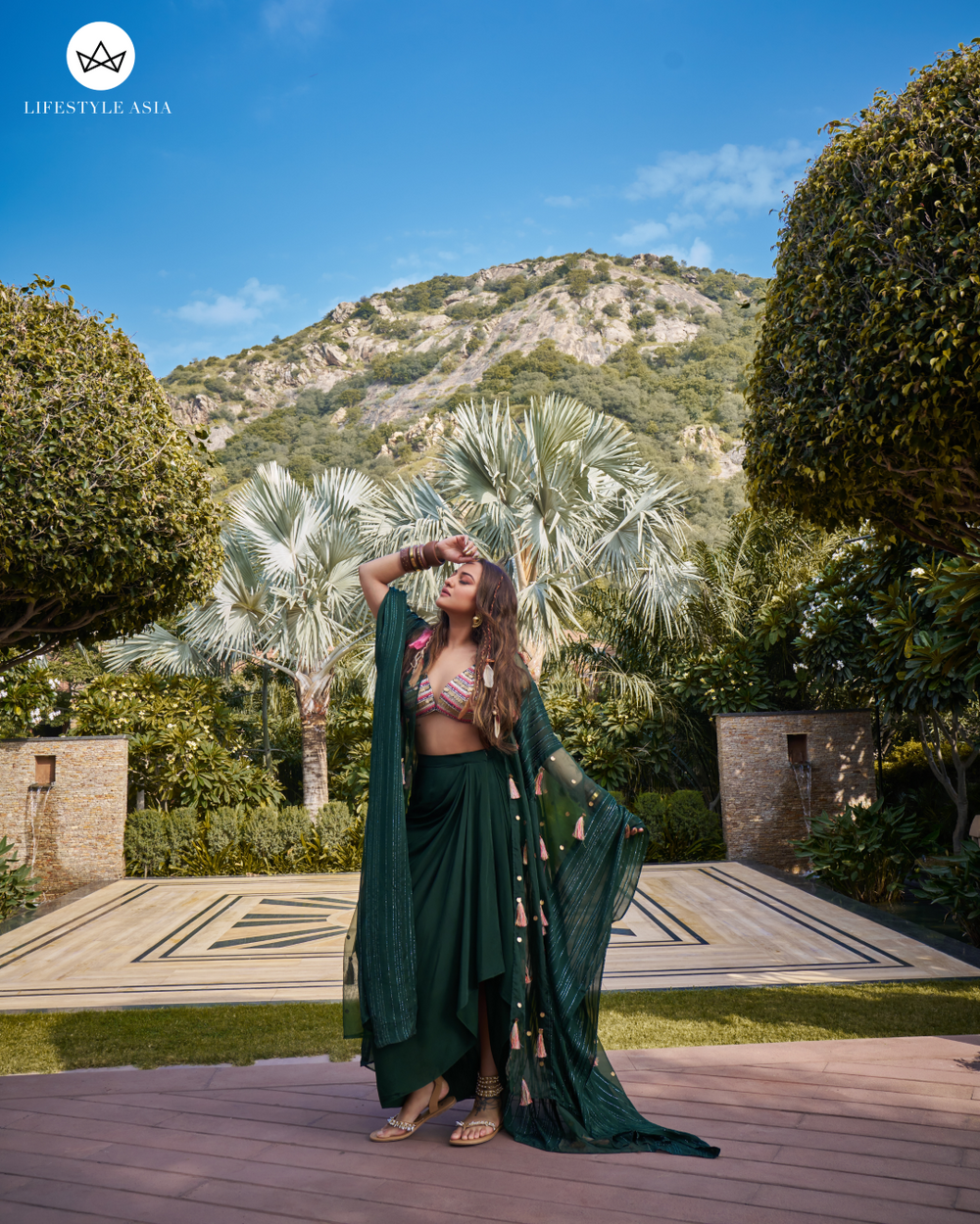 Putting forward this appealing kate mate set with deep plunged neckline blouse paired with bottle green drape skirt and tassel detailed floor-length RV signature cape .