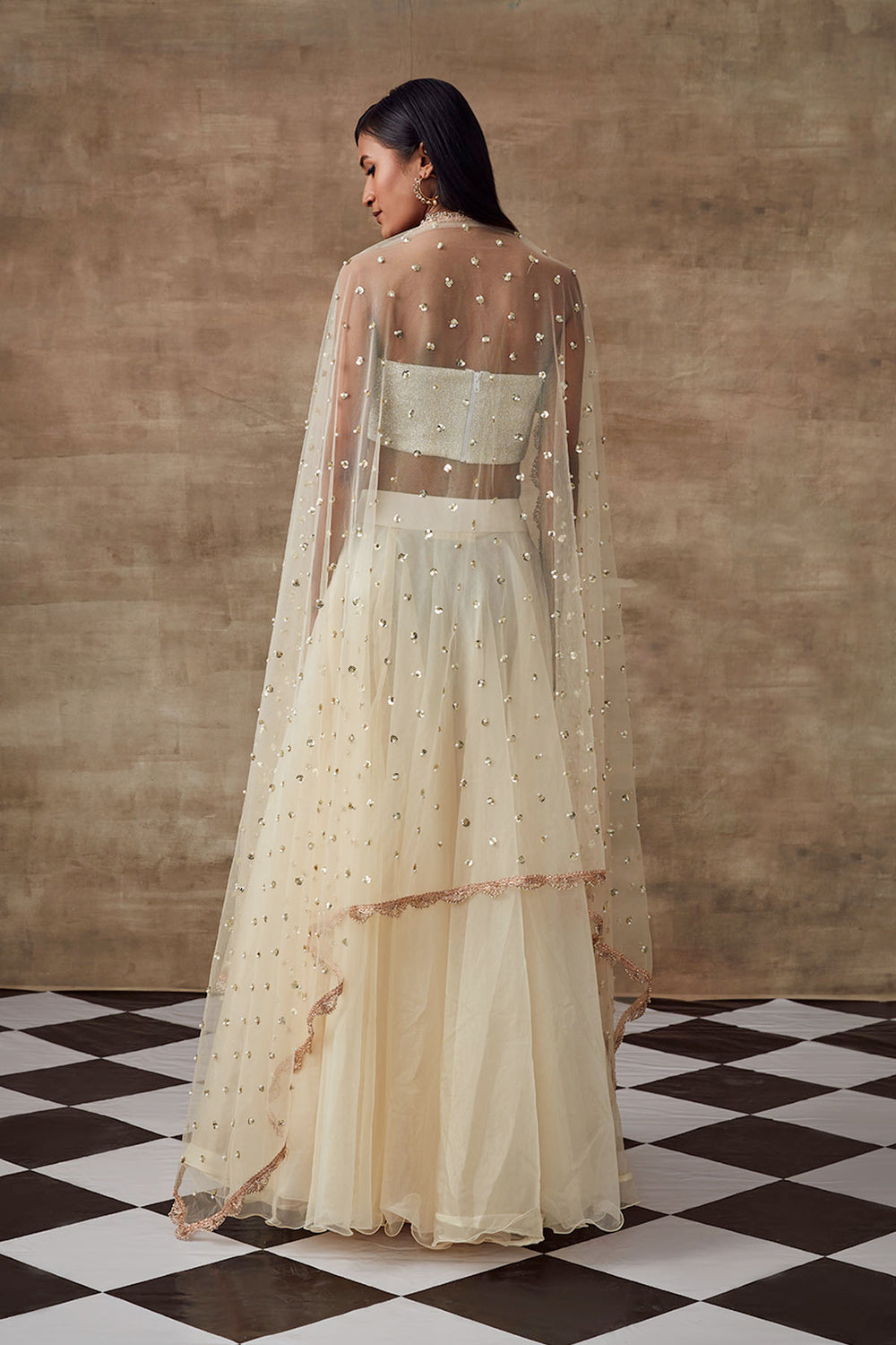 Featuring a Silver foiled fitted corset top with linen skirt enhanced with pearl & sequinned net duppata .