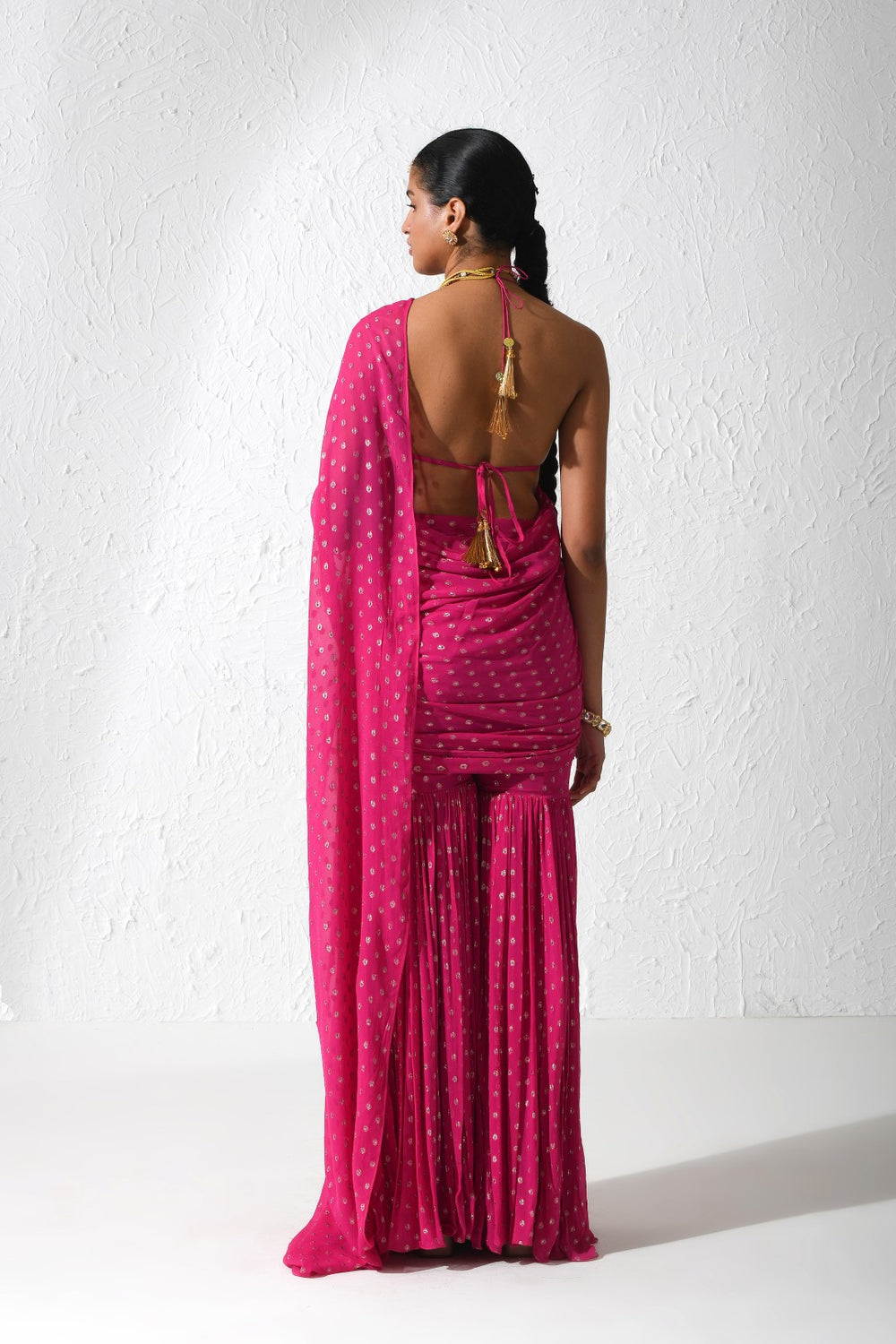 The zardozi hand embroidered bralette is teamed up with a gharara pant with pre attached palla.