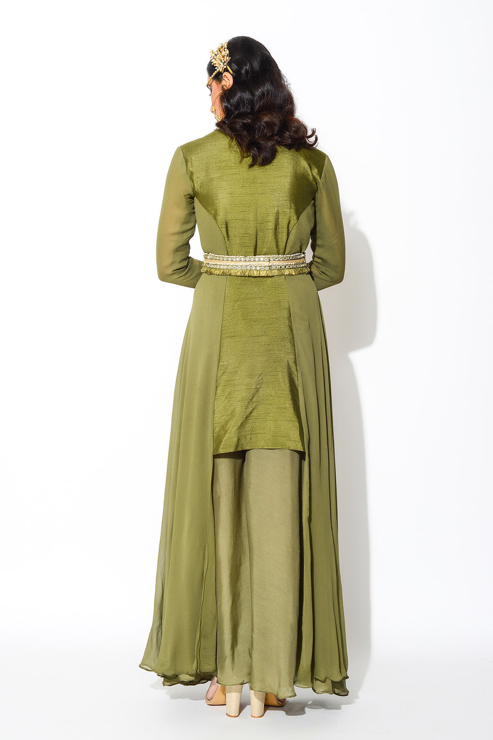 Featuring An Olive Green Asymmetrical Kurta In Raw Silk And Georgette Base. It Is Paired With Matching Color Palazzo Pant In Crepe Fabric And Belt