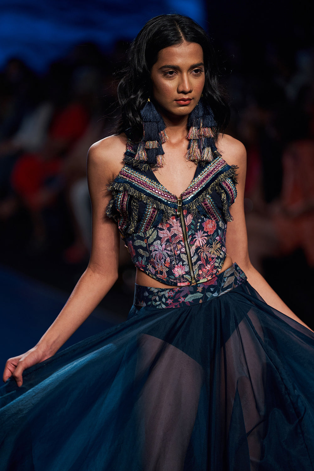 Presenting a whole coachella vibe outfit with corset top with tassel embellishment paired up with organza see through long flared skirt