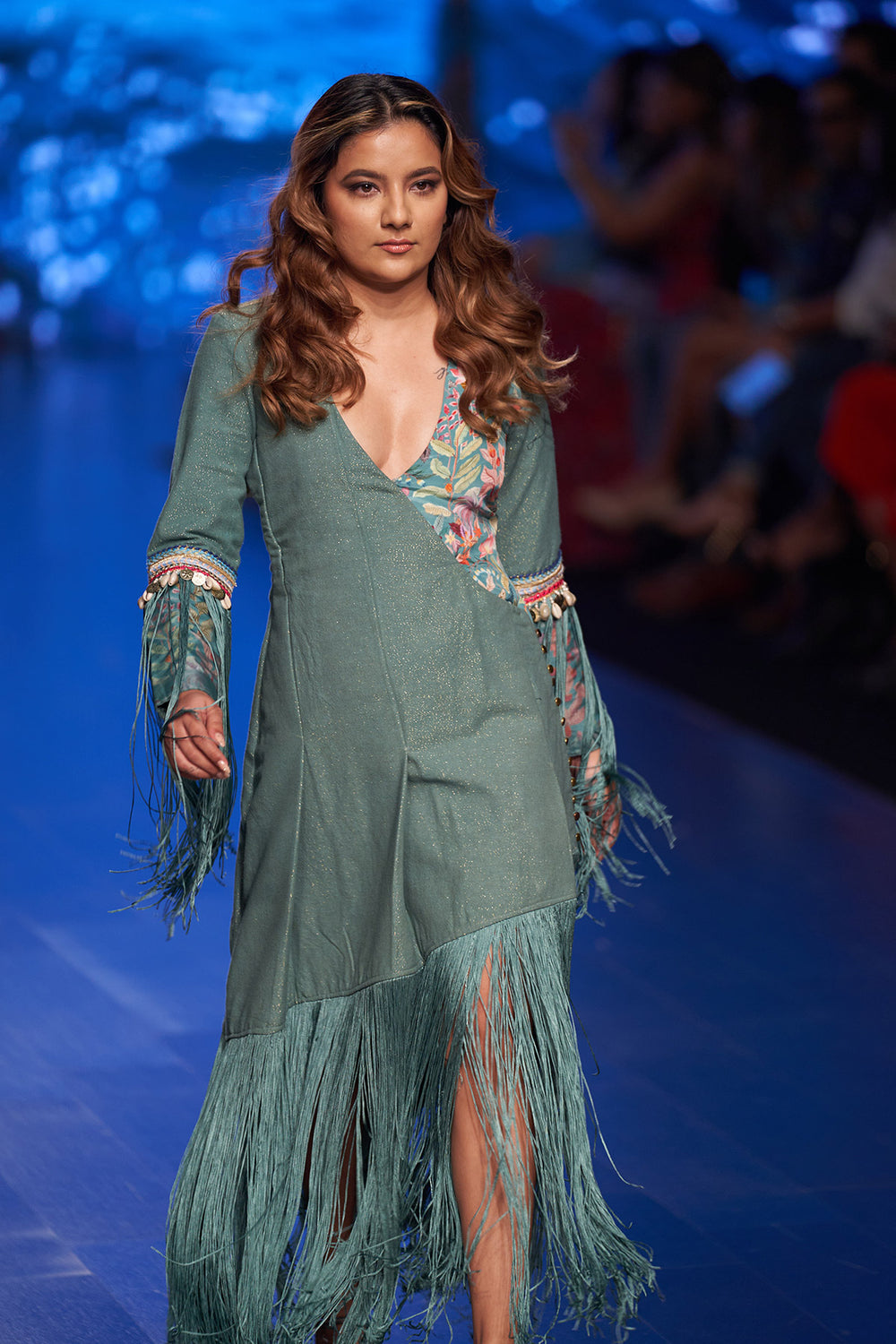Putting forward this ethnic angrakha style half printed dress adorned with shell and fringe detailing.