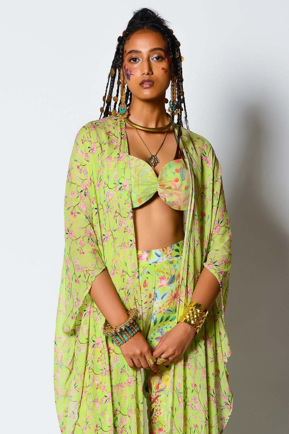 Featuring A Loose Georgette , Gathered Hem Line Cape , Teamed Up With The Signature Printed Brallet Paired With Printed Gharrara .