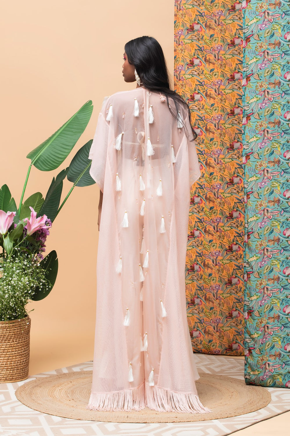 Featuring fully embroidered bralet with tassels at back & embellished cape with multi Different tassels and fringes.
