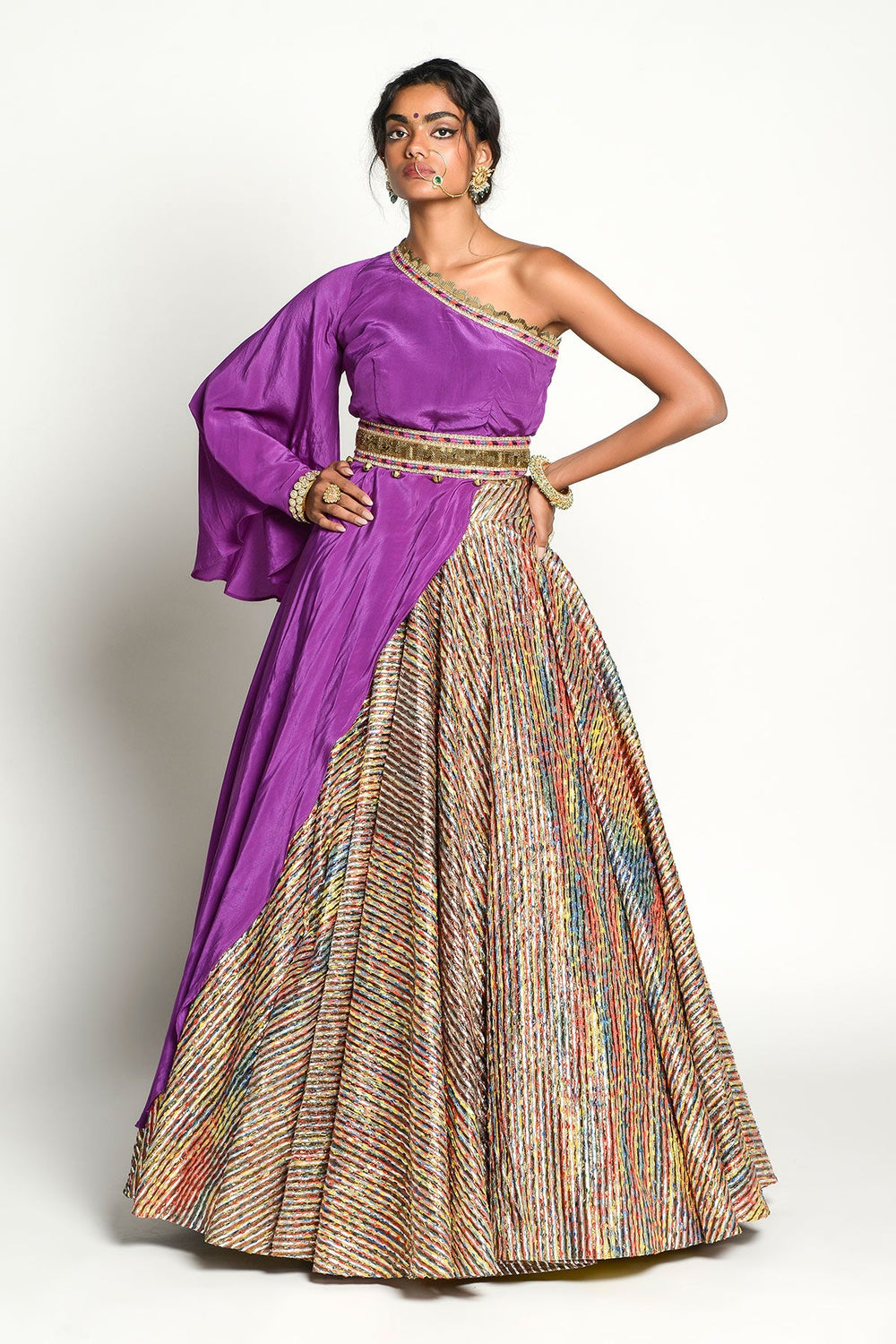 The Chanderi Lehnga Highlighted With Multicolored Threads, Is Paired Deftly With A Contrasting Amethyst One Off Shoulder Ensemble Offset With Cut Daana, Dabka And Thread Work Belt