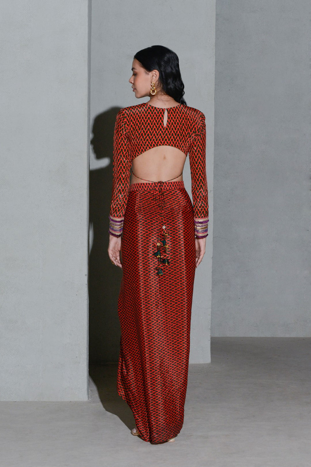 Dare Garnet Set, a striking ensemble crafted from luxurious crepe in a rich red hue. This set features a crop top and skirt, adorned with intricate trims and applique detailed embroidery at the cuff and underbust. Perfect for special occasions