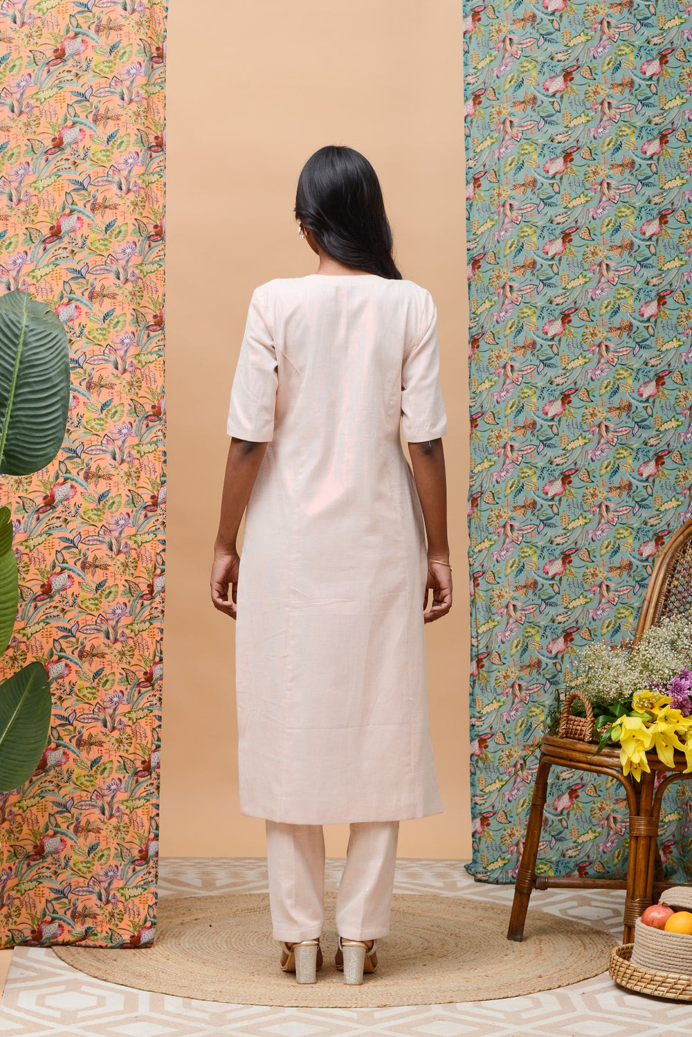 V neck straight kurta with details at the front paired with straight pants with rose gold organza dupatta with trim details at the border