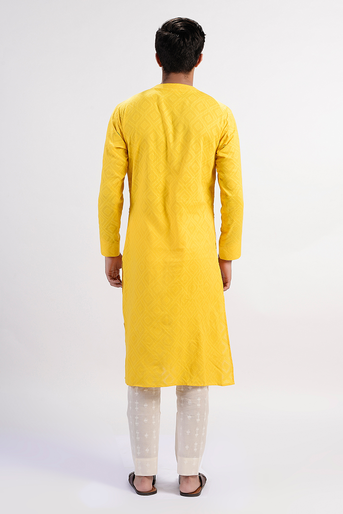 Featuring a yellow colored linen kurta, enhanced and beautified by white pearls and knottings in a rombhus in two variant sizes.