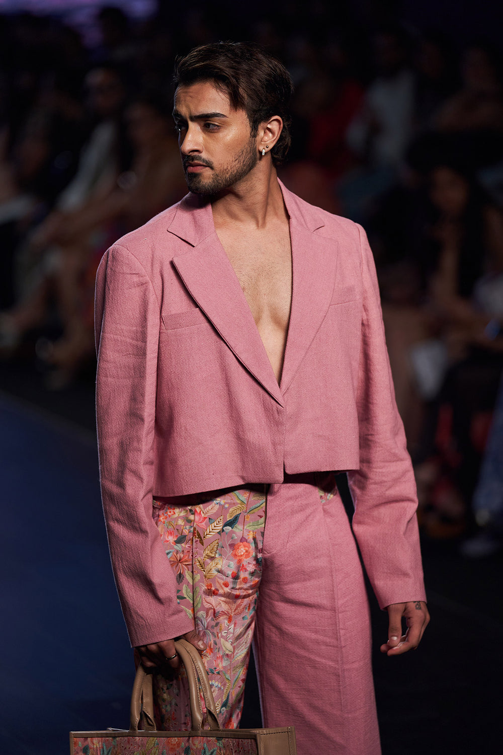Presenting this elegant orchid pink co-ord set with cropped lapel colar paired up withhalf tropical print straight leg pants