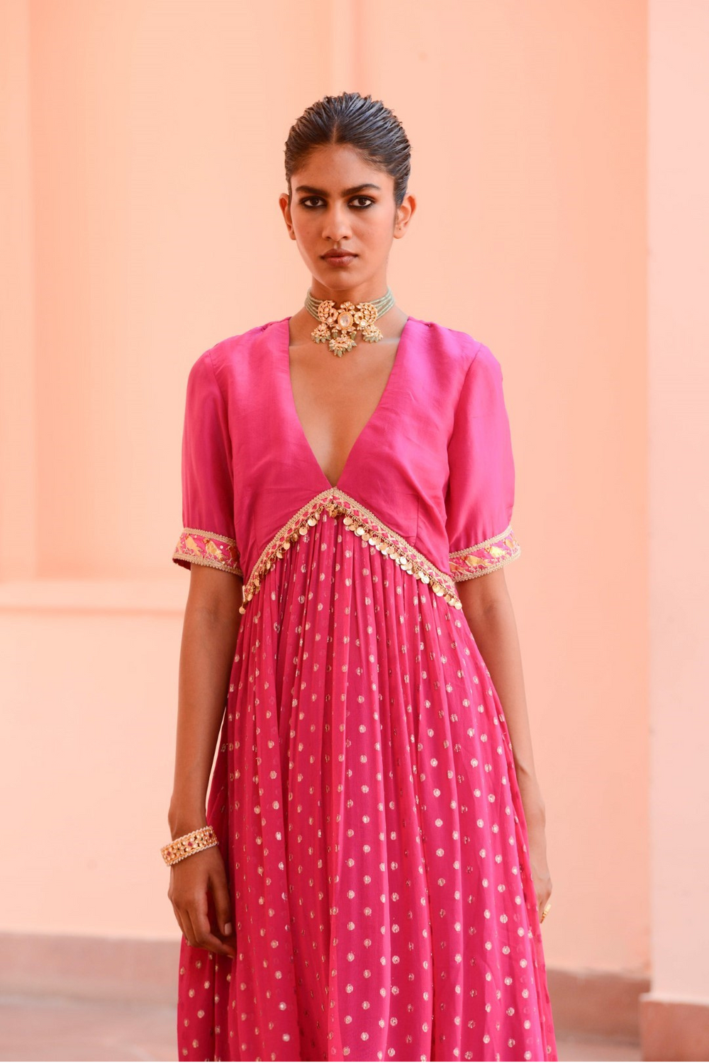 Featuring hot pink A-Line Kurta With Metallic Coins And embroidered sleeves Paired With pink crepe palazzo.