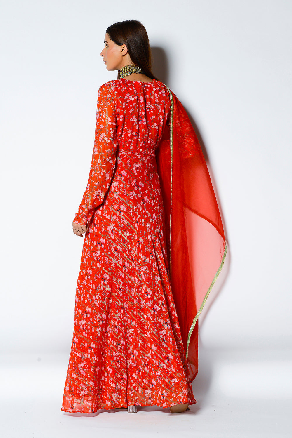 Featuring A Ultra Modish Geogette Anarkali,With Angrakha Neckline Details With Organza Dupatta In A Red Papprika Colour.