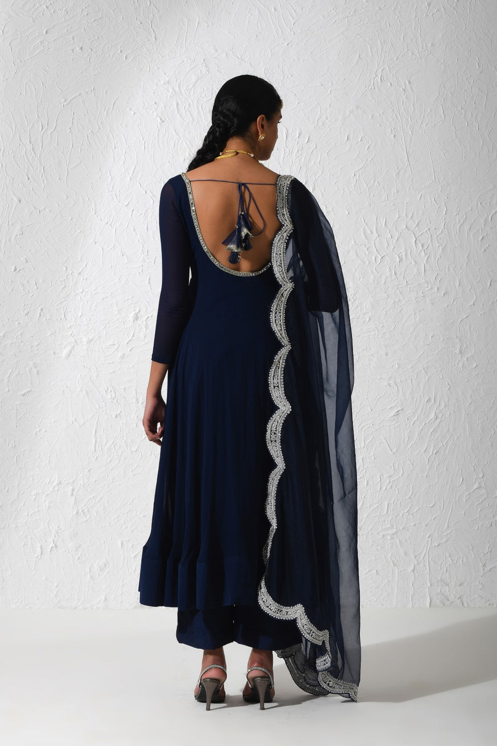 This elegant plain Georgette Anarkali is paired with wide-legged pants featuring hand embroidery at the bottom, complemented by a Zardozi dupatta with scalloped details.