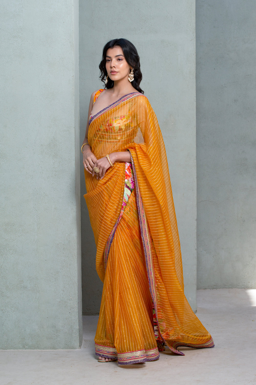 Yellow Saree in organza is a stunning choice for haldi ceremonies and festive occasions. Adorned with elegant trim details, Pair it with statement earrings and heels for a chic, memorable look.