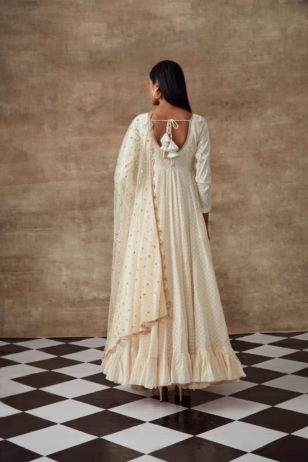Featuring An Ivory Kalidaar Anarkali Enhanced with the Frills at Edges Essembled With net dupatta with pearl & sequin details.